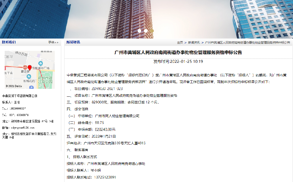 關(guān)鍵詞:鼎點(diǎn)娛樂工程咨詢有限公司(以下簡稱“招標(biāo)代理機(jī)構(gòu)”)受廣州市黃埔區(qū)人民政府南崗街道辦事處 (以下簡稱“招標(biāo)人”)的委托,對廣州市黃埔區(qū)人民政府南崗街道辦事處物業(yè)管理服務(wù)資格項目”進(jìn)行公開遴選采購。現(xiàn)評審工作已圓滿結(jié)束,現(xiàn)就本次招標(biāo)的中標(biāo)結(jié)果公告如下:一、項目編號:ZDYRGD-2021-023二、項目名[詳細(xì)]